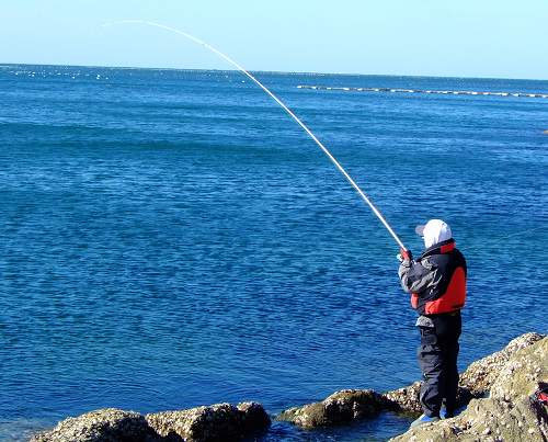 當鱸魚洗鰓時將頭昂出水面,觀察魚鉤所扎魚嘴位與下壓魚竿動作是同步的,要求釣者是眼快手快。如果觀察到魚扎鉤位置很好,所配備工具又能承受該條鱸魚的掙扎力量時,向下壓竿的動作力度也可大些,遛魚的時間也可縮短。如果觀察到鉤子所扎位是魚嘴脆弱部位時,就要多個心眼: