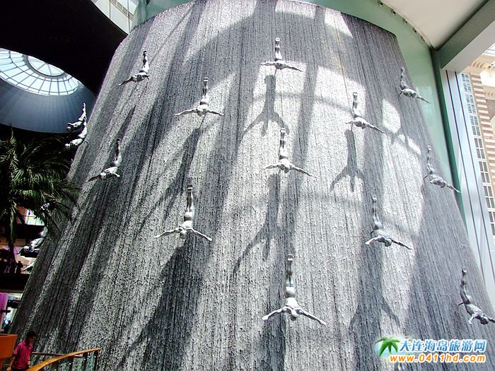 迪拜購物中心中的人工瀑布景觀,構成了現代商業空間的新構思、新發展,購物中心的中庭空間歷來是設計師精心設計的地方,中庭空間中設置瀑布景觀將中庭設計帶來了新的思路。每一件雕塑作品都是一個高臺跳水的動作,并且動作相同,整齊劃一,吸引了不少游客駐足拍照。