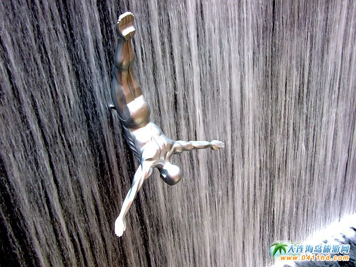 迪拜購物中心中的人工瀑布景觀,構成了現代商業空間的新構思、新發展,購物中心的中庭空間歷來是設計師精心設計的地方,中庭空間中設置瀑布景觀將中庭設計帶來了新的思路。每一件雕塑作品都是一個高臺跳水的動作,并且動作相同,整齊劃一,吸引了不少游客駐足拍照。