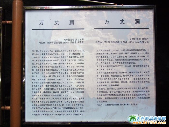 濟(jì)州島萬丈窟是由漢拿山噴出的火山熔巖形成的溶巖洞窟,總長度為13.4公里,規(guī)模居世界第一,向游客開放的僅是其中約1公里長的洞區(qū)。