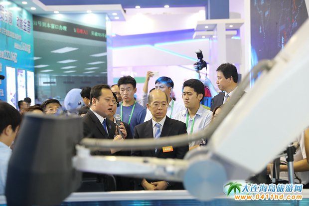 遼寧省委常委、大連市委書記譚作鈞在金普新區商務局局長王大生陪同的陪同下觀看金普展區