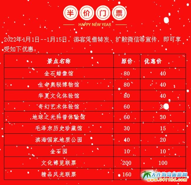 2022年1月1日--1月15日,游客憑借轉(zhuǎn)發(fā)、擴(kuò)散微信等宣傳,即可享受如下優(yōu)惠: