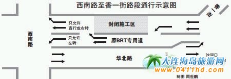 昨日下午,先是來到華北路與西南路交叉路口,市交警支隊交通秩序管理處、科技處以及沙河口區交警大隊的交警正在這里進行研究。沙河口區交警大隊副大隊長楊權告訴記者,華北路的西南路至香一街路段因施工封閉之后,對周邊道路帶來了較大的影響。華北路一直是進出市的一條主要通道,車流壓力一直比較大,此次道路部分開通之后,肯定會帶來緩解作用。交通秩序管理處副處長任貴海告訴記者,開通后,交警部門對該路段的通行方式進行了比較大的調整。原本的BRT專用道將變為出市方向的單行道,車輛在臨近西南路路口時,應注意根據需要變換車道。“BRT專用道內的車只允許左轉,需要直行或右轉的車輛應在臨近路口處向右并道進入外側車道。”任貴海說,交警會在這里設置指示標志,引導車輛通行。
