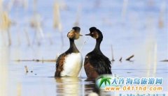 大連旅游景象:日前,在一塊濕地中幸運地見到了幾只國家二級重點保護鳥類黑頸鸊鷉,這種鳥美麗且稀有。...