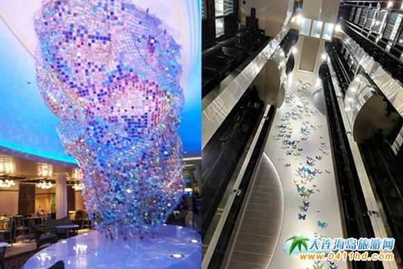 順著笑臉的方向,映入眼簾的便是船上鮮亮而豪華的大堂,繼續一邊走一邊欣賞著游輪內部,隨處可見文藝優雅的裝飾裝潢,各式各樣人性化的設施和娛樂項目一應俱全。