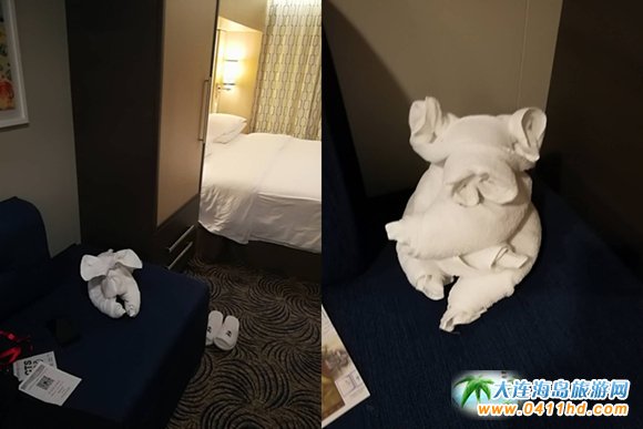 量子號游輪上的客房基本分為內艙房、海景房、陽臺房和套房。內艙房位于船身內部,房間沒有窗戶,但墻壁上安裝了電子顯示屏,實時播放著室外的海景,使人視覺上感到如窗戶一樣。陽臺房是以4星級酒店的要求為標準,里面各種設施一應俱全,服務生一天兩次打掃衛生,驚喜的是會在房間里看見用毛巾做出的栩栩如生的動物造型。
